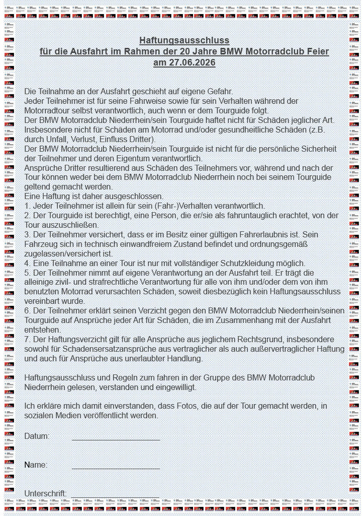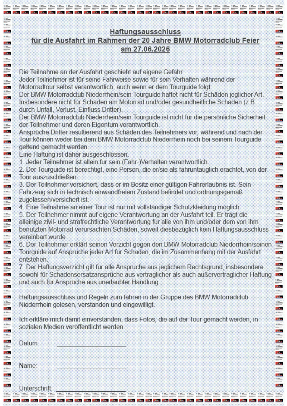 Druckversion - Haftungsausschluss Ausfahrt 20 Jahre Feier und fahren in der Gruppe